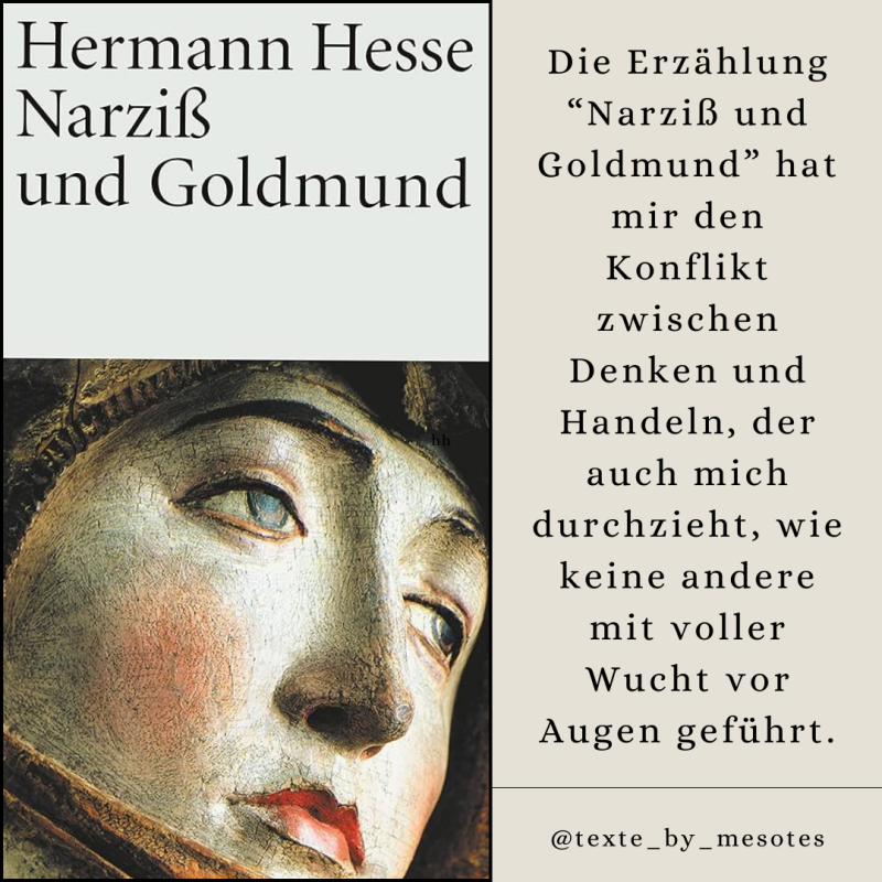 Den Lebenswegen dieser beiden Protagonisten kann man in der gleichnamigen Erzählung „Narziß und Goldmund“ von Hermann Hesse aus dem Jahr 1930 folgen und wird dabei beobachten können, wie sie sich mal anziehen und mal abstoßen, mal ergänzen und mal beschränken. Doch scheinen sie immer in Verbindung zu stehen. Schnell wird klar, dass beide für übergeordnete Prinzipien stehen: Denken und Handeln, Zurückhaltung und Lust, Ethik und Moral, Theorie und Praxis.