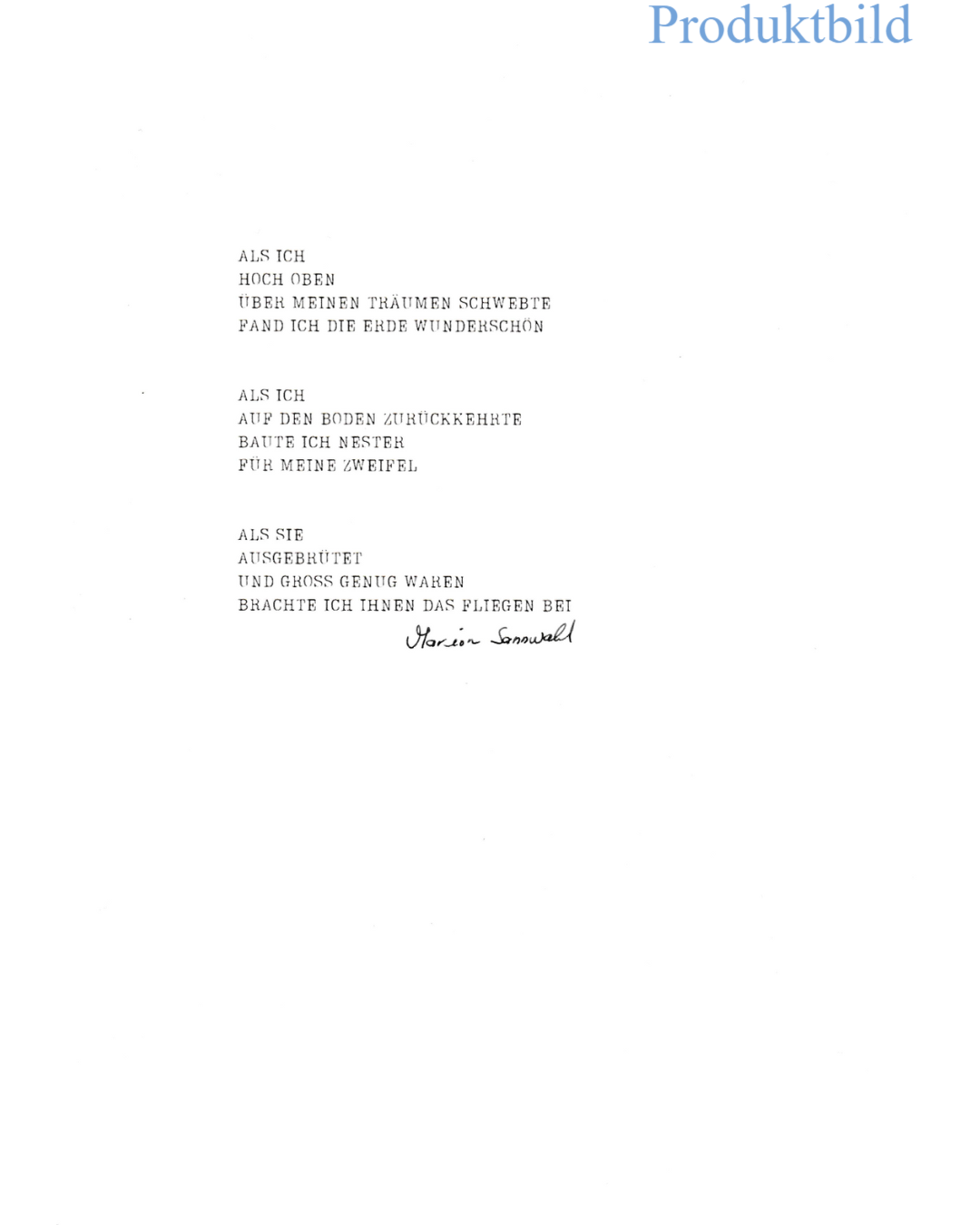 Die Gröẞe des Werkes ist DIN A4. Es wurde auf hochwertigem Papier gedruckt und trägt die Unterschrift der Autorin. Du erhältst mit dem Kauf ein einzigartiges Unikat.
